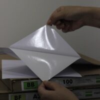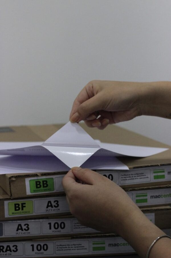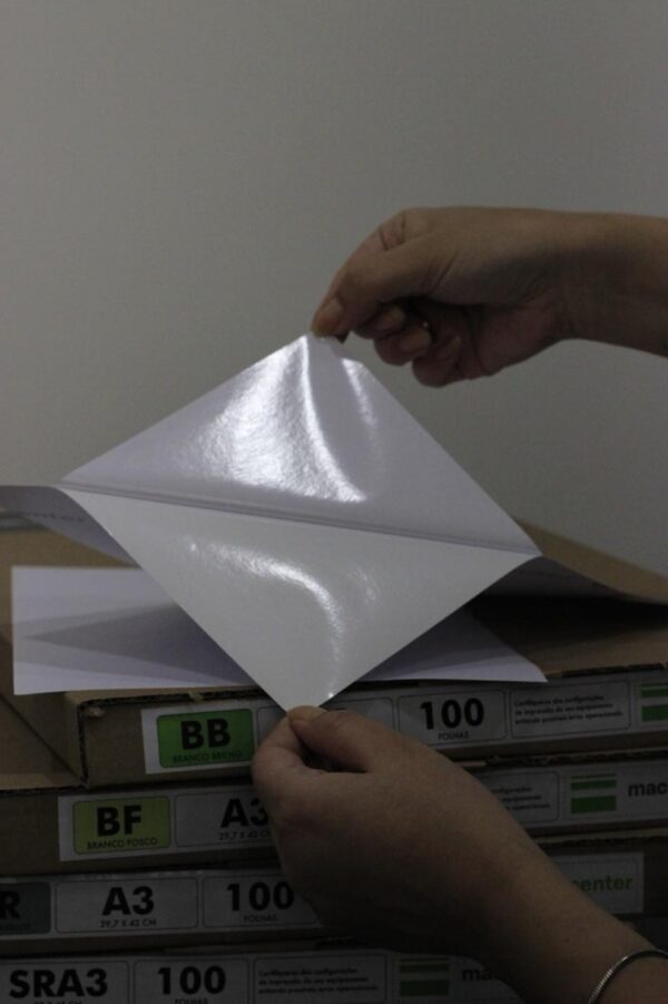 Vinil adesivo com acabamento brilhante, tratado para impressoras laser. Pacote com 100 folhas, à prova d’água e pronta entrega.